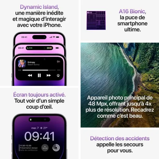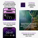 Caractéristiques Île dynamique. Écran toujours allumé. Technologie ProMotion avec taux de rafraîchissement adaptatif jusqu’à 120 Hz. Écran HDR. True Tone. Large gamme de couleurs (P3). Haptic Touch. Contraste 2 000 000:1 (standard). Luminosité maximale de 1 000 nits (standard), luminosité maximale de 1 600 nits (HDR) et luminosité maximale de 2 000 nits (extérieur). Revêtement oléophobe résistant aux empreintes digitales ; Affichage simultané de plusieurs langues et jeux de caractères ;